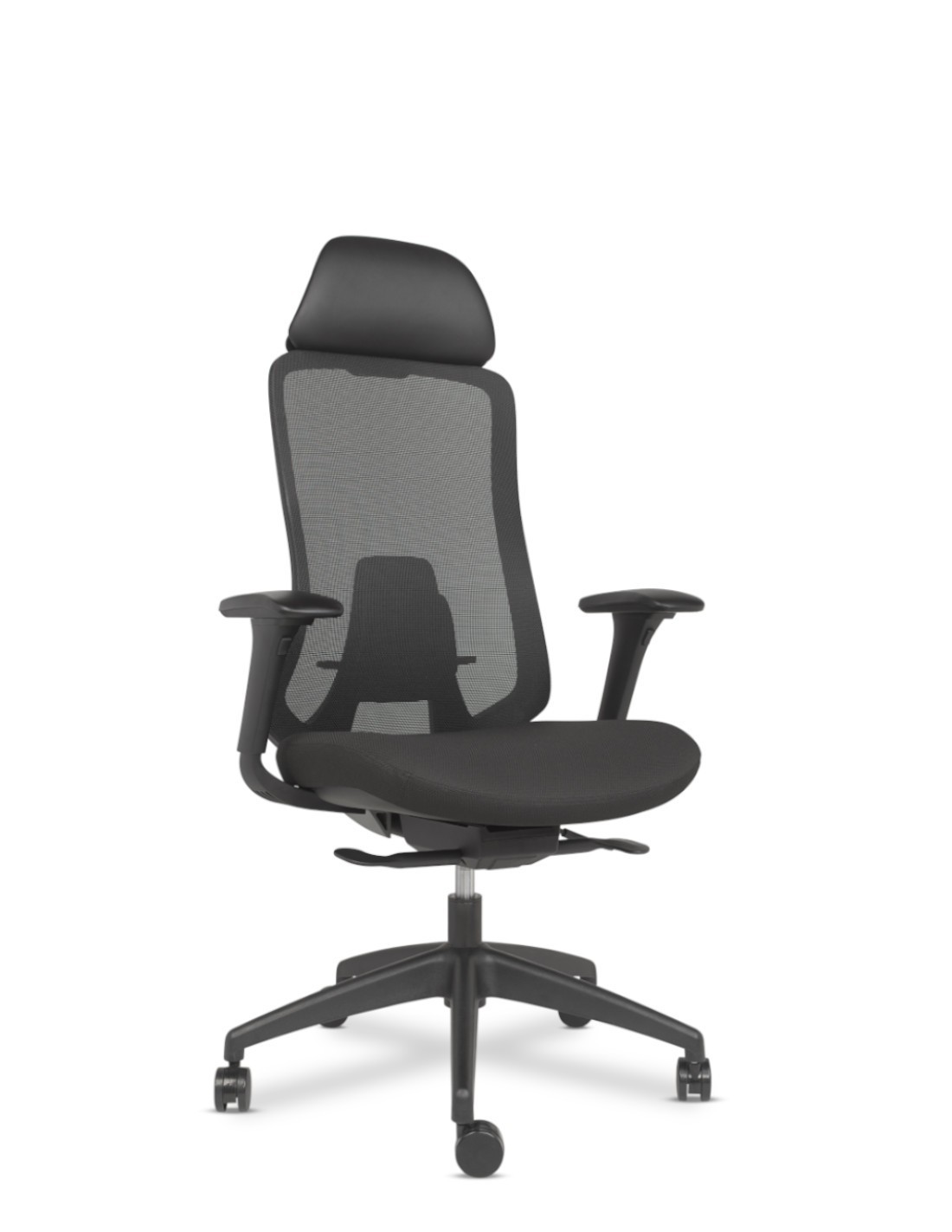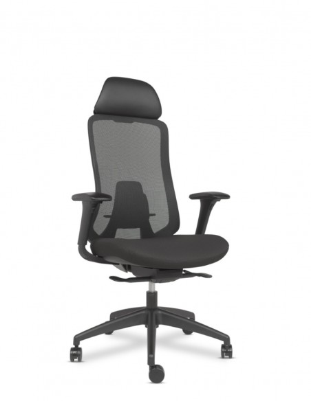 Silla Operativa Respaldo Malla Ignífuga Negra con Cabezal y Brazos 4D. Asiento relleno de goma flexible en base de acero, de alta densidad de 50 kgs/m3. Funda de tela ignífuga color negro fabricada 100% polyester.